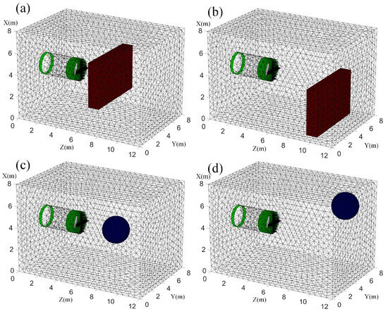 The finite-element method (FEM) is used to construct the three-dimensional forward model, and when image reconstruction is carried out, the forward model is dissected into networks. Then, the network density of the surrounding rock is selected to be more refined, and the network density of the TBM model and the undesirable geological body is selected to be ultra-refined, taking into account the requirements of calculation accuracy and saving in calculation time. The size of the forward model is consistent with the simulation model established in Section 2.4. According to the actual situation, the undesirable geological bodies existing in front of the tunnel face are simplified into two models, which are a rectangular high-resistance anomalous body simulating faults and a spherical low-resistance anomalous body simulating water-bearing caverns, as shown in Figure 9a,b representing the rectangular anomalous body and Figure 9c,d representing the spherical anomalous body. These anomalous bodies are distributed in front of the tunnel face. The dimensions of the rectangular anomalous body are 4 m × 4 m × 0.5 m, and one is located at the center axis of the tunnel at 3.5 m proximal to the tunnel face, and the other is located at the lower left of 6 m distal to the tunnel face; the radius of the spherical anomalous body is 1.2 m, located at 3.5 m proximal to the tunnel face and 6 m distal to the upper right of the tunnel face, respectively.