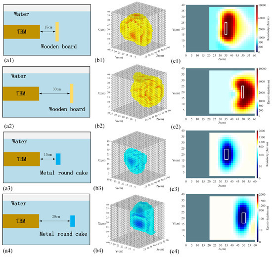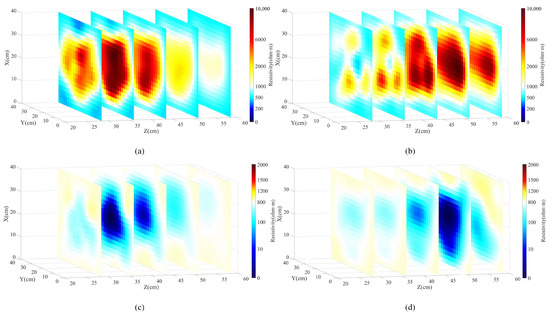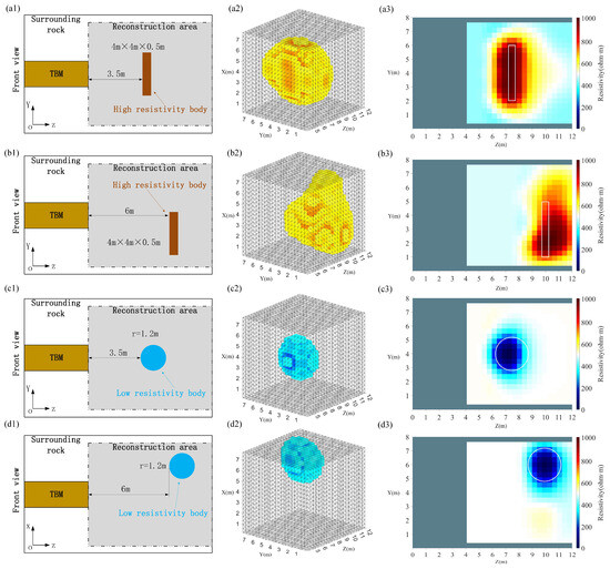 Simulation model and reconstructed results. The (a1–d1) represent a schematic of the location of the high-resistance anomalous body and the low-resistance anomalous body; the (a2–d2) represent a map of the 3D reconstruction results; the (a3–d3) represent a 2D sliced image passing through the center of the anomalous body along the Y-axis.