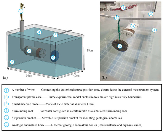 The schematic diagram of the built flume-simulation experimental platform and the layout of the indoor experimental model are shown in Figure 11. The geometric similarity ratio of the experimental model is 1:100. The size of the water tank is 60 cm × 40 cm × 45 cm, the height of the water surface is 40 cm, and a certain proportion of salt water is configured to simulate the surrounding rock. The simulated TBM model consists of PVC hollow pipes, copper electrodes, and several wires. The PVC hollow pipe simulates the TBM fuselage during the excavation process. A hoop of ring-shaped copper sheets is attached to the front end of the PVC hollow pipe as a simulated shield, and the ring-shaped copper sheets are used as the focusing electrodes. Considering that electrical insulation is required between the simulated cutterhead and the electrode, a PVC round cover is used as the simulated cutterhead, and hot melted glue is used to fill the space between the simulated cutterhead and the PVC hollow pipe. A cross-shaped electrode array is installed on the simulated cutterhead, with an electrode diameter of 0.4 cm and an electrode spacing of 1 cm. Another ring-shaped copper sheet is arranged behind the PVC hollow pipe as a receiving electrode, and waterproof cement is used to fill the gaps around each electrode to prevent water leakage. Above the water tank, an experimental box is set up with a mounting suspension, which is used to hang the undesirable geological bodies. Wires are used to connect the electrode array and the measurement system to collect data.