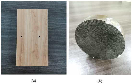 In this experiment, two different foreign objects were selected as the anomalous body in front of the tunnel face. To evaluate the feasibility of this study, the two anomalous bodies were a high-resistance wooden board and low-resistance metal discs. The resistivity ratio of salt water to wooden boards and metal disks is similar to the ratio of the actual resistivity of surrounding rock to the resistivity of water-bearing caves and faults. The high-resistance wooden board had a length of 20 cm, a width of 10 cm, and a thickness of 1.5 cm, and the low-resistance metal discs had a diameter of 9 cm and a height of 2.5 cm. The two anomalous bodies are shown in Figure 12. During the experiment, the TBM model was placed in the middle of the left side of the experiment box, and the anomalous bodies were placed 15 cm from the proximal end of the TBM model and 30 cm from the distal end of the TBM model, which was on the same axis with the TBM model. The measurement strategy proposed in Section 2.5 was used for data collection.