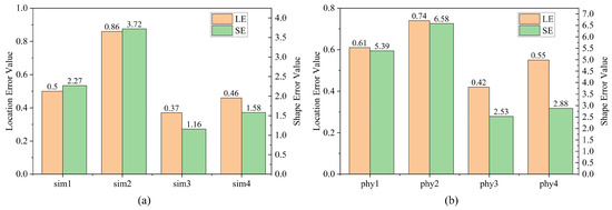 The image evaluation index is used to evaluate the reconstruction results of the simulation experiment and physical experiment, and the calculation is performed using Equations (15) and (16). The reconstruction quality evaluation results of the simulation experiment are shown in Figure 15a. In the figure, sim1 represents the rectangular high-resistance abnormal body located 3.5 m near the tunnel face, and sim2 represents the rectangular high-resistance abnormal body located 6 m below the far end of the tunnel face. sim3 and sim4 represent the spherical low-resistance abnormal bodies located at the proximal and distal ends of the tunnel face, respectively. It can also be seen that the spherical low-resistance abnormal body near the tunnel face has the smallest and values, indicating that its reconstruction quality is high. The reconstruction quality of the spherical low-resistance abnormal body at the far end of the tunnel face is slightly higher than that of the rectangular high-resistance abnormal body at the proximal end of the tunnel face. The and values of the rectangular high-resistance abnormal body located at the far end of the tunnel face are relatively large, indicating that the reconstruction quality is slightly lower.
