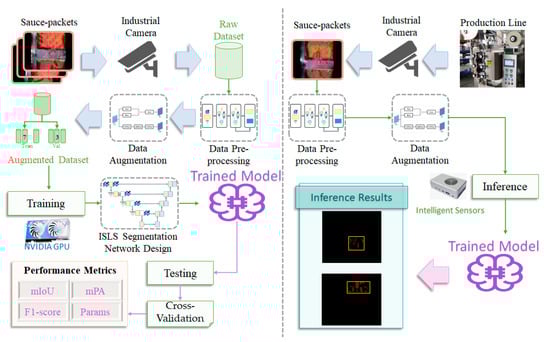 We propose illumination-aware sauce-packet leakage segmentation (ISLS) for the industrial production line, as illustrated in Figure 1. The ISLS method includes an NVIDIA GPU and an intelligent sensor with a hardware accelerated EdgeAI development environment. We train the model on NVIDIA GPU and perform inference on intelligent sensors.
