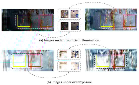 The results of ULIE images are shown in Figure 3, where the left image is the non-optimized image, and the right image is the optimized image. Figure 3a shows that the image has improved overall illumination, with a clearer boundary between the leakage and the background. The ULIE method effectively enhances the image contrast and clarity. Figure 3b reveals that the illumination of the optimized image is more balanced. The ULEIE method alleviates the phenomenon of local overexposure, which further proves that our method effectively avoids gray jump []. We perform convolution and downsampling operations on the yellow and red box regions, obtaining the corresponding feature maps between non-optimized and optimized images. It is shown that the details of the optimized feature map are more obvious. In summary, through the above process, our method can effectively enhance the details and textures of sauce-packet images under insufficient illumination and overexposure.