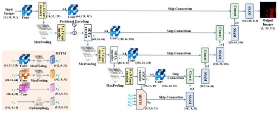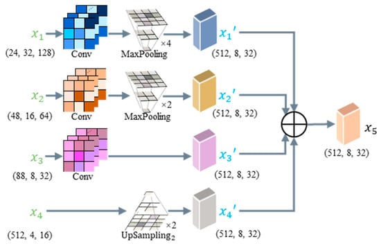 Secondly, has the same size as the output. Therefore, the MFFM only needs to utilize a 1 × 1 convolution to adjust the channel number of the feature map to 512, as shown in Equation (10):