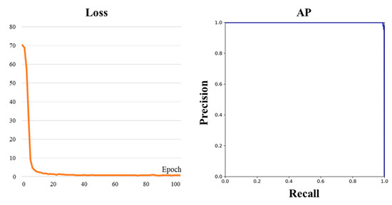 Segmenting the entire image increases the computational burden, and it is challenging to differentiate between the connection and the main sauce, as shown in Figure 6, often resulting in incorrect segmentation. Therefore, during the illumination-aware region-enhancement stage of the ISLS, we employ YOLO-Fastestv2 for ROI cropping. The dataset for YOLO-Fastestv2 is divided into a training set and a validation set with a ratio of 7:3. The input image size for YOLO-Fastestv2 is set at 888 × 1112, while the output image dimensions are resized to 128 × 512. The ROI images are enhanced by the ULIE method and inputted into the leakage region segmentation stage of the ISLS. The training process and evaluation indexes of YOLO-Fastestv2 are illustrated in Figure 8. Significantly, YOLO-Fastestv2 attained the AP of 99.95%, which can primarily be attributed to the simple and uniform features of the sauce-packet connections.