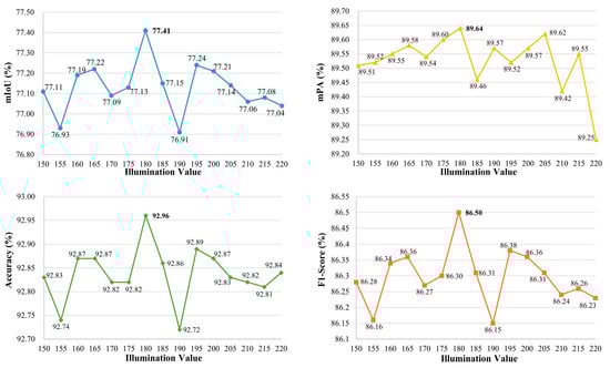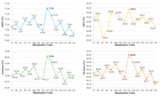 We employ the grid search method to explore the optimal illumination thresholds of ULIE for insufficient illumination and overexposure. And the controlled variable method is utilized to reflect trends in performance. In the case of insufficient illumination, to validate the optimal threshold as 115, we maintain the overexposure threshold at 180. We adjust the insufficient illumination threshold within the range of 75 to 145. The ISLS evaluation indices (i.e., mIoU, mPA, Accuracy, F1-score) for different thresholds are shown in Figure 9. We observe that the evaluation indices reach their optimum when the threshold is set at 115.