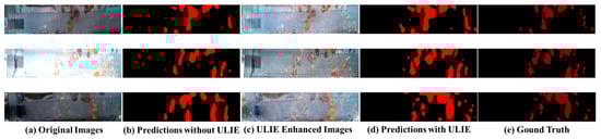 The actual leakage segmentation of sauce packets is often influenced by uneven light sources, which consist of insufficient illumination and overexposure. To relieve the problem of image blurring caused by uneven illumination, we propose the uneven-light image-enhancement (ULIE) method, employed in the illumination-aware region-enhancement stage of ISLS. The ULIE method is inspired by the relevant image-enhancement algorithms [,,]. Our ULIE method can enhance the illumination of sauce-packet images under insufficient illumination conditions and improve the image contrast and texture details under overexposure conditions.
