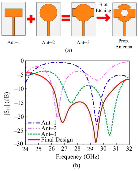 (a) Design stages of suggested antenna, (b) impact of design stages on |S11|.
