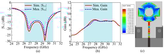 The S-parameter graph of both the prototype tested and the model simulated was generated by the design that is recommended in Figure 4a. The illustration shows that the schematic provided an impedance bandwidth (|S11| < −10 dB) of 26.1–30.7 GHz, with resonance frequencies of 26.5 GHz and 29.5 GHz. The outcomes of the equipment test and the software results indicated an elevated level of consistency. Figure 4b shows the gain versus frequency plot of the suggested antenna. With a peak gain of 9 dBi at roughly 27 GHz, the recommended antenna provided a gain of >8 dBi over the operational bandwidth of 26.1–30.7 GHz. Between simulated and tested findings, there was a notable degree of consistency. The value of gain and bandwidth offered by the suggested work make it a capable and best applicant for future 5G devices. The current distribution of the proposed antenna at 28 GHz is given in Figure 4c. It can be seen that the current was fairly distributed across the radiator, which resulted in a symmetrical radiation pattern across the X-axis.