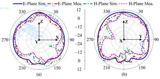 Figure 5a,b display the computed and hardware prototype-tested radiation pattern of the designed antenna for particular frequencies of 28 and 30 GHz. According to the supporting figure, the aerial had a regular shape with a low back and level side lobes. The antenna radiated over a broadside pattern in the E-plane (θ = 0°) and H-plane (θ = 90°) at both operational frequencies.