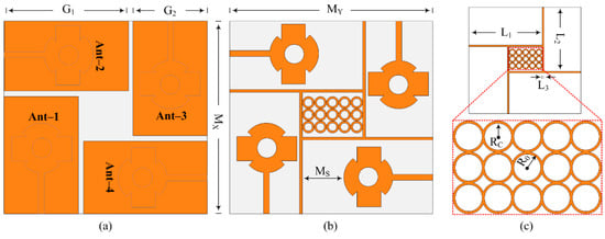 Geometrical structure of suggested DGS and parasitic patch loaded MIMO antenna. (a) Back view, (b) front view, (c) parasitic patch.