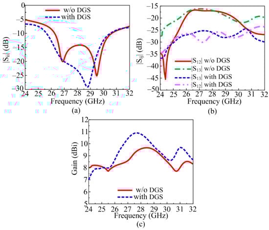 As in the literature review, various techniques were used to minimize mutual coupling, one of which was introducing DGS. This fact has also been seen in literature studies: defected ground structure (DGS) also helps in the improvement in bandwidth and gain. The novel DGS was employed in the suggested MIMO antenna to not only refine mutual coupling but also upgrade the gain and bandwidth. The novel DGS was obtained by etching the rectangular slot from the center and the strip line slot out of the copper layer of the ground plane. The results in Figure 8a–c show the comparison between results obtained from the simple MIMO antenna and the MIMO antenna with DGS. It can be examined from the figures that the antenna with DGS offered a wide bandwidth of 25.5–30.3 GHz. The value of the gain of the suggested MIMO antenna was also improved from 9.25 to 10.9 dBi, as given in Figure 8c. The mutual coupling, which is a key parameter to analyze, was improved from −17.25 to −27.5 dB. The transmission coefficient between the adjacent antenna (|S12|, |S23|, |S34|, |S41|), as well as the diagonal element (|S13|, |S24|), are given in Figure 8b.