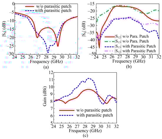 Comparison between simple MIMO antenna and MIMO antenna with Parasitic patch. (a) Reflection coefficient, (b) transmission coefficient, (c) simulated gain.