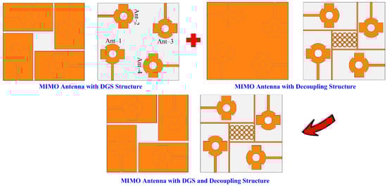 Multiple-input–multiple-output (MIMO) antenna systems have gained a lot of attention owing to their ability to expand the capacity and reliability of wireless communication systems [1]. The rectification of the devices is undertaken to obtain performances according to the needs of 5G and future 6G communication systems [2]. Modern-day devices require a high data rate and high-speed coverage along with the rising challenge of size constraint, which results in a huge demand for low-profile and compact RF components [3,4]. These changes in communication models force the designer to further revise the requirements of antenna design. For MIMO antennas, mutual coupling between the antennas can considerably affect the outcomes of MIMO systems [5]. Therefore, there is a dire need to develop techniques to lower the coupling among MIMO elements and consequently improve the performance of MIMO systems [6].