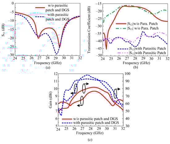 Comparison between simple MIMO antenna and MIMO antenna with DGS. (a) Reflection coefficient, (b) transmission coefficient, (c) simulated gain.