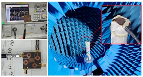 For the verification of the software-generated results and suggested concept, the hardware of the design was fabricated. The fabricated prototype was examined by utilizing a vector network analyzer (VNA) of model N5224A for the near-field S-parameter verification and an anechoic chamber for the far-field measurements, as given in Figure 12. The large similarity between the tested and software-generated results was observed, which shows the potential of suggested antenna. The little difference may be due to imperfections in the measurement framework or fabrication tolerance.