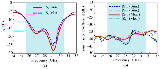 In Figure 13, the contrast between simulated and tested S-parameters in terms of reflection and transmission coefficients is given. It can be noted from Figure 13a that the suggested parasitic patch and DGS-loaded 4-port MIMO antenna give wide impedance bandwidth (|S11| < −10), ranging from 25.6 to 30.4 GHz for millimeter-wave applications. Across the band, for the mutual coupling of the suggested antenna, as demonstrated in Figure 13b, the antenna had a mutual coupling of <−35 dB for the orthogonal element, whereas the mutual coupling was <−44 dB for the adjacent element. The offered value of the mutual coupling was less than −20 dB, which is under the acceptable range. Moreover, the similarity in tested and software-generated outcomes is also observed from the figures. The resemblance in tested and software results and operational values of reflection and transmission coefficients cause the suggested antenna to be a dominant applicant for future 5G devices.