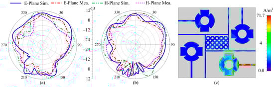 Figure 14a,b shows the preferred MIMO antenna’s tested and software-generated radiation pattern, which included a parasitic patch and a DGS. The radiation pattern at the targeted frequencies of 28 and 30 GHz was examined. The figures show that the antenna delivered a constant pattern with low back and level side lobes. For both operational frequencies, the aerial radiated over a broadside pattern in the E-plane (θ = 0°) and H-plane (θ = 90°). Additionally, the suggested MIMO antenna design’s resemblance of the tested and predicated patterns revealed a striking similarity, making the antenna a great candidate for upcoming 5G applications. Furthermore, the current analysis in Figure 14c revealed the effectiveness of the decoupling structure, which stops the current from being induced in other elements, resulting in low coupling.