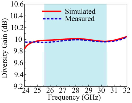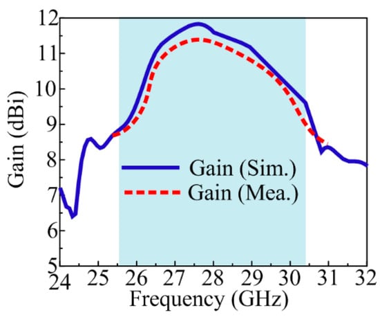 Figure 15 depicts the simulated and hardware-tested gain-versus-frequency curve of the suggested MIMO antenna. It can be noticed from the figure below that the preferred MIMO antenna with DGS and parasitic patch offers a large value gain over the operational region. The antenna offers gain > 9 dBi over the operational band of 25.5–30.5 GHz with a peak value of 11.9 dBi around 28 GHz. Moreover, the strong resemblance between tested and simulated gain makes the suggested antenna a viable candidate for high-gain devices using 5G in the near future.