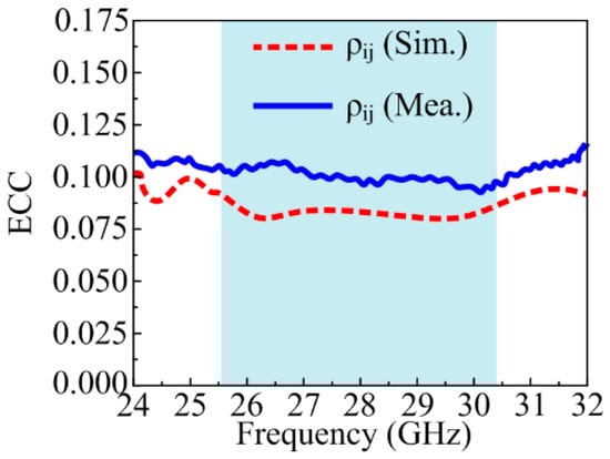 The ECC of the suggested antenna was calculated with respect to electric fields. represents the first vector field, while the second vector field is represented by . Moreover, represents the complex conjugate of the first electric field. The simulated and measured results illustrated in Figure 16 show that the proposed antenna offers a low ECC < 0.12 in the band of interest. The ECC value will result in high spectral efficiency along with high reliability and data rates.