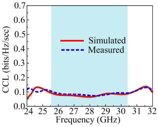 Figure 18 shows the CLL of the suggested parasitic patch and DGS-loaded MIMO antenna. The suggested design offers a CLL of around 0.1 bits/s/Hz through all operational bands.