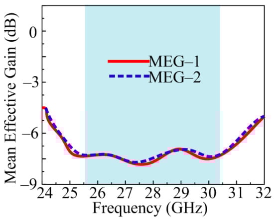 Mean effective gain (MEG), which is the ratio of incident and received power, is another crucial MIMO metric. This parameter’s allowable range should be from −3 dB to −10 dB. Also included below [50] is the mathematical relationship used to calculate the MEG.