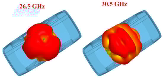 The suggested antenna was simulated over a model car to verify its practical usage for V2X (vehicle to everything) communications by considering the accuracy of the location as described in [51,52]. The DGS is very sensitive to the ground plane, so this analysis validated the antenna performance over car models for practical applications. The suggested antenna was placed 6 mm above the roof of the car, which is usable for almost all practical applications [53,54], as given in Figure 20. The radiation pattern, shown in Figure 21, represents the identical behavior of the antenna over the model car. The 3-D pattern of the radiation behavior in the figure below was analyzed when port 1 was excited.