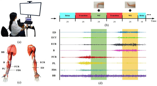 Experimental setup: (a) The experiment process scene. (b) The flow chart of experimental tasks. (c) The diagram of the electrode position. (d) The EMG signals were acquired.