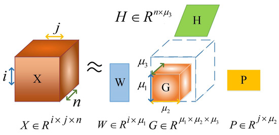 Tensor decomposition is an effective method to extract high-dimensional data features. This method can be used to extract the hidden potential features of different dimensions in the data structure and the interaction information between different dimensions. The Tucker model is one of the most prominent and commonly used models in tensor decomposition. Figure 2 shows the third-order Tucker tensor decomposition model. Here, the tensor X can be decomposed into a core tensor G and factor matrices W, H and P, which are on different dimensions.
