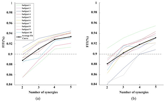 where is the original tensor; is a reconstructed data tensor decomposed by NTD. R is artificially selected, and the range of selection is . The threshold is 90%. It is considered that when the FIT value is greater than 90% and the increase in FIT is less than 2% with the increase in the value, then stop the calculation, and select the current value as the number of muscle synergies.