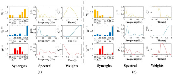 To further explore the space–frequency–time muscle synergy feature in different movement stages, NTD was used to decompose the same sEMG signals as the NMF decomposition. Figure 5 shows that each movement can be decomposed into muscle synergy modules, muscle spectrum components and weighting functions. In Figure 5a, Synergy 1 consisted mainly of the activation of PL and FDS, which were activated in the first 1.5 s of the WF stage. The spectral curve P(1) can be observed, showing that the muscle synergy matrix had a significant activation occur at approximately 13 Hz, with spectrum components mainly for 0–20 Hz; Synergy 2 mainly recruited BB and was activated in the second 1 s of WF stage. It can be observed from the spectral curve P(2) that the muscle synergy matrix had a significant activation occur at approximately 25 Hz, with the spectrum component of the muscle synergy matrix being mainly in the band 10–30 Hz; Synergy 3 mainly consisted of ECR and FCR, which were activated during the first 1 s. The spectral component of the muscle synergy matrix is mainly in the band 25–50 Hz.