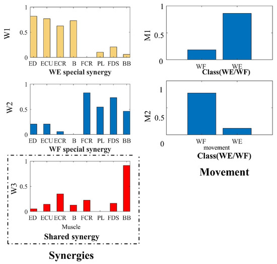 The results showed that for upper limb muscle synergy, although there were differences in muscle synergy among different subjects, there was a certain regularity on the macro level. Similar results were also shown with NMF. In addition, there was a shared synergy between muscle synergies in different movements of WF and WE, which reflects the common function between different movements, while specific synergies determine the formation of different movements.