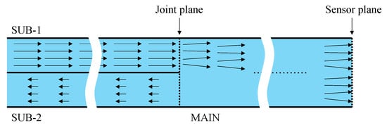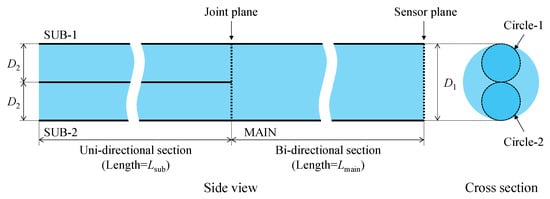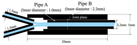 Subsequently, as shown in Figure 9b, SUB-1 and SUB-2 were inserted into Pipe A and secured using instant adhesives. The ends were trimmed after the adhesive had adequately dried. Moreover, at this stage, the end of Pipe A took on the appearance depicted in Figure 9c, revealing SUB-1 and SUB-2 (at this point, the distinction between SUB-1 and SUB-2 is inconsequential) within the 1.0 mm inner diameter of Pipe A surrounded by solidified instant adhesive filling the remaining space. The R2S sensor was constructed by bonding the SUB-1 and SUB-2 sides to the MAIN side at the center of Pipe B using an instant adhesive, as illustrated in Figure 9d. The longitudinal cross-section of the connected segment is illustrated in Figure 10. This whole process of manufacturing an R2S sensor could be simplified if a proper coupler specifically designed for this structure were to become available in the future.