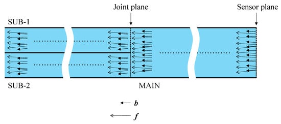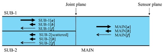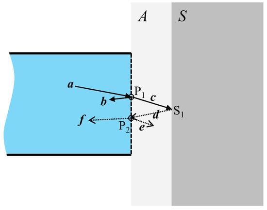 In Figure 5, a represents the incident light reaching P1 on the sensor plane. A portion of a is reflected at the boundary between the sensor plane and material A, forming light b, which maintains a consistent intensity and is unaffected by corrosion on the steel surface. The refracted light passing through the boundary surface traveled through material A as c and reached S1 on the surface of material S. The reflected light at S1, depicted as d, was influenced by the surface condition of material S and arrived at P2 on the sensor plane. Segment d is reflected as e at the boundary between material A and the POF. However, the remaining refracted portion entered the POF as f and propagated leftward within the POF. This process occurred uniformly across the sensor plane, contributing to the leftward-traveling light in the new sensor, as illustrated in Figure 6.