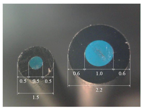 Figure 8 shows a POF cable with a 1.5 mm outer diameter employed for the SUB-1 and SUB-2 fibers (PGS-CD 501-10-E produced by TORAY) and a POF cable with a 2.2 mm outer diameter employed for the MAIN fiber (PGS-CD1001-22-E produced by TORAY). The black regions represent the polyethylene sheaths, while the blue zones indicate the core part of the POF, with diameters of 0.5 mm and 1.0 mm, respectively.