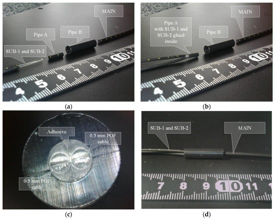 Assembly stages for R2S sensor. (a) POF cables and pipes before assemblage, (b) after SUB-1 and SUB-2 are set in Pipe A, (c) cross-section of Pipe A, and (d) completed connection.