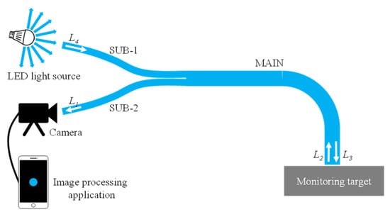 Figure 3 shows the structure of the new POF sensor specifically designed for this purpose. The MAIN fiber, with a length of Lmain and a diameter of D1 (1 mm), had its right end serving as the sensor plane. Two POFs, with lengths Lsub and diameters D2 (0.5 mm), were attached to the MAIN fiber using adhesive. One of these fibers (SUB-1 fiber) was linked to a light source, while the other (SUB-2 fiber) was connected to an image-processing unit.