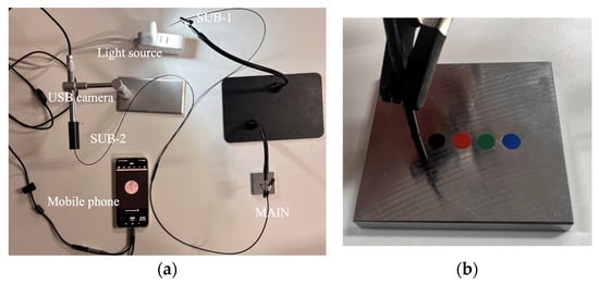 Layout of preliminary experiment. (a) Overall layout of preliminary experiment, and (b) R2S sensor and steel plate with vinyl tapes of different colors.