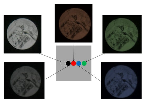 As shown in Figure 12b, a steel plate (50 mm × 50 mm × 5 mm) was prepared and adorned with circular vinyl tape of distinct colors (black, red, green, and blue) with a diameter of 5 mm. The sensor plane of the MAIN fiber was placed in direct contact with the steel plate, and its position was changed to the black, red, green, or blue tape spots. The reflected light returning to the end of the SUB-2 fiber at each position was recorded using a microscope camera, as shown in Figure 13. A color change in front of the R2S sensor was identified, thereby confirming its fundamental functionality.