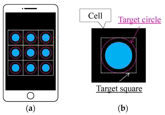 Basic features of graphic application software. (a) Multiple POF sensors captured in each cell defined on screen of smartphone (image); and (b) definition of target square housing one POF sensor, for which average values of R, G, and B are calculated.