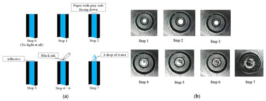 To validate the functionality of the proposed R2S sensor before conducting an actual corrosion experiment, a preliminary experiment was conducted in a dark room with the R2S sensor oriented upward. The lengths of the SUB-1, SUB-2, and MAIN fibers were set to 70 cm and 60 cm, respectively. Eight sequential steps (steps 0–7), as illustrated in Figure 15, were performed to ascertain proper functioning of the R2S sensor at each stage. In Step 0, with nothing above the R2S sensor, the measurement commenced when the light source was turned off and maintained for approximately 20 s. Subsequently, in Step 1, the light source was activated, directed into the SUB-1 fiber, and held for approximately 20 s. In Step 2, a circular piece of paper with an approximate diameter of 1 mm was cut from regular copier paper, colored gray (to simulate the color of steel), and placed on the R2S sensor with the gray side facing downward. In Step 3, a piece of paper was affixed to the R2S sensor using a commercially available instant adhesive, and its state was maintained for approximately 20 s. In Steps 4, 5, and 6, the top surface of the paper was incrementally marked using an oil-based black marker pen, gradually covering the entire surface with black ink that penetrated the paper strip and was detected using the R2S sensor. In the final step (Step 7), a water droplet was applied to a piece of paper to assess the effect of moisture, and the droplet was held for approximately 2 min.