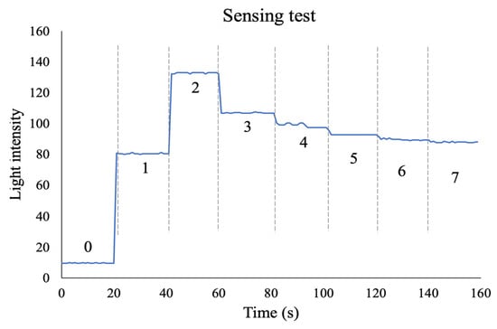 In Steps 4–6, black ink was incrementally applied to the top surface of the paper, directly above the sensor surface, using an oil-based magic marker pen. Consequently, the entire piece of paper gradually became black. Throughout this process, the R2S sensor recorded a gradual decrease in light intensity, mirroring the progressive darkening of the region facing the sensor plane. Finally, to assess the impact of moisture, a water droplet was applied to the paper for permeation. This action marginally decreased the light intensity captured by the R2S sensor, suggesting that, despite a stable color in front of the sensor, a slight fluctuation in the light intensity was observed, which was attributed to moisture.
