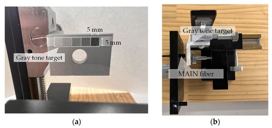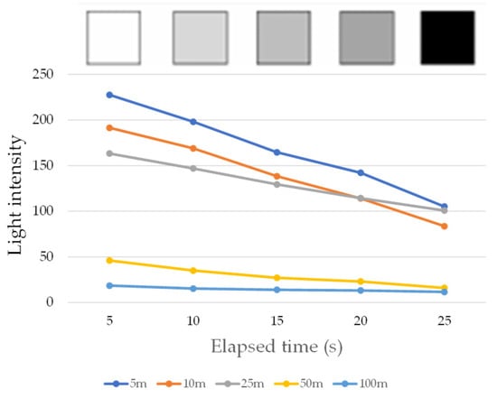 For this experiment, we prepared a gray tone paper that transitioned from white to black in five increments, as shown in Figure 17. The plane of the R2S sensor was then pressed onto each area (5 mm × 5 mm) to record the measured changes in light intensity. MAIN fiber lengths of 5, 10, 25, 50, and 100 m were utilized. The LED light source and camera employed for image capture were consistent with those utilized in the previous test.