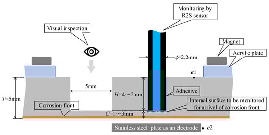 A corrosion experiment was conducted to show the performance of the proposed R2S sensor using an SS400 steel plate measuring 50 mm in length, 50 mm in width, and 5 mm in thickness. In the experiment, the bottom side of the plate was exposed to a corrosive environment to track the corrosion phenomenon starting from the bottom and progressing upward until a specified corrosion thickness (C) was reached. Moreover, several 2.2 mm diameter holes (with depth denoted as H) were arranged on the upper side of the steel plate to facilitate the installation of R2S sensors during the experiment.