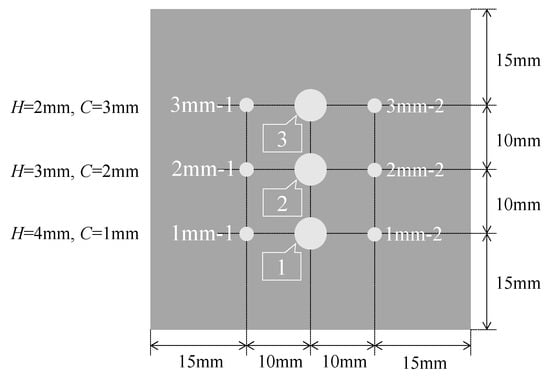 The corrosion experiment aimed to verify whether the progress of the corrosion zone could be systematically captured using the proposed R2S sensors. The corrosion depths (C) detected by the R2S sensors were set to 1, 2, and 3 mm. Figure 20 illustrates the positional arrangement of the six sensor holes. For example, the sensor holes (with diameters of 2.2 mm) 1 mm-1 and 1 mm-2 were prepared for C = 1 mm. Similar treatments were performed at C = 2 mm and 3 mm. Additionally, observation holes 1 (C = 1 mm), 2 (C = 2 mm), and 3 (C = 3 mm), with diameters of 5 mm, were created at the midpoints of the sensor installation holes.