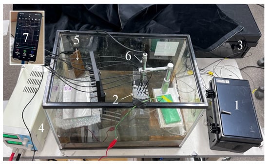 Overall layout of experimental apparatus. (1) Box containing LED light source. (2) Steel plate. (3) Box containing SUB-2 cables from R2S sensors. (4) Direct current control unit. (5) Stainless-steel plate. (6) USB camera used to observe open holes. (7) Mobile phone for graphic image analysis.