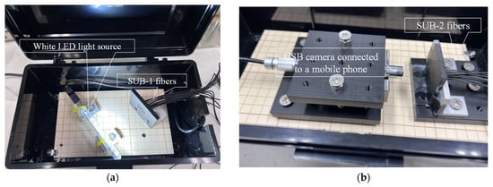 A preliminary experiment based on the concept shown in Figure 11 was conducted to validate the functionality of the R2S sensor using the apparatus shown in Figure 12a, where the lengths of the SUB-1, SUB-2, and MAIN fibers were set to 70 cm and 60 cm, respectively.