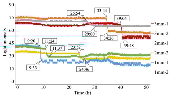 For the sensors installed at 2 mm-1 and 2 mm-2, the arrival of the corrosion zone was recorded at 26:54 and 23:52, respectively. The subsequent variation in light intensity exhibited a similar pattern to those observed at 1 mm-1 and 1 mm-2.