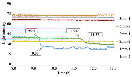 The second arrival of the corrosion zone was detected by the sensor installed at 1 mm-2 at 11:24. Subsequently, the light intensity of the sensor declined sharply until approximately 11:37, when the bottom of the hole was completely covered by the corrosion zone. Subsequently, it exhibited stable behavior until the final stage, with occasional fluctuations. Despite some subsequent changes, the sensor maintained regular behavior until the end of the experiment.
