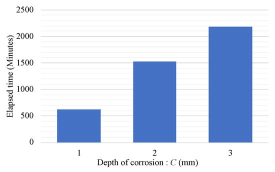 Additionally, because two R2S sensors were employed for each corrosion depth, the average time for the initial capture of the corroded zone is shown in Figure 26. From these results, it is evident that by installing the proposed R2S sensors at different depths, the progression of corrosion areas can be quantitatively and clearly understood.